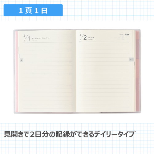 PAGEM by NOLTY(ペイジェム バイノルティ)シリーズの日記帳 【月間ページ】見開き1ヵ月のベーシックなブロックタイプ(日曜始まり)。カレンダーと同じような感覚で見ることができ、月ごとの予定が把握しやすいのが特長です。 【日記欄】見開きで2日分の記録ができるデイリータイプ。予定だけでなく、日記やイラストを書いたり、スクラップブックとして活用するなどさまざまな用途に使えるレイアウトです。 ※表紙を変更しました