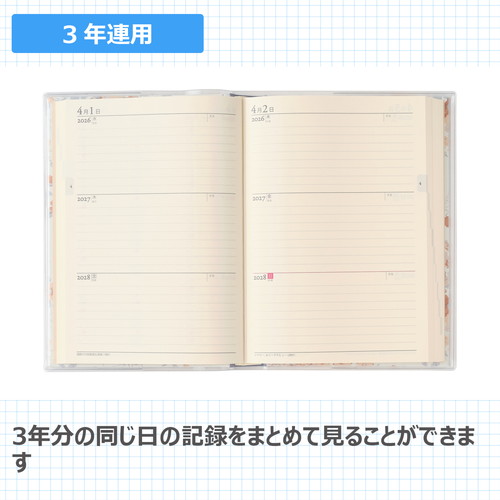 花柄で人気のイギリスのブランドLAURA ASHLEYのダイアリーシリーズ 【月間ページ】見開き1ヵ月で日付が縦に並ぶ罫ページタイプ。長期の予定を書くのに便利です。 【日記欄】3年分の同じ日の記録を一覧できる3年連用タイプ。日記や育児日記などにおすすめのレイアウトです。 思い出の写真など入れておくのに便利なポケットアルバムが付いています。 ※表紙を変更しました