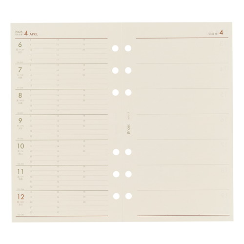 能率手帳の会社がつくるシステム手帳ブランドBindex by NOLTY (バインデックス バイ ノルティ)のリフィル(バイブルサイズ)。 午前・午後・夜が一目でわかるゾーンスケジュールタイプ。1日単位でメモ書きができるケイ線入り。