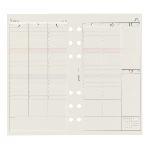 能率手帳の会社がつくるシステム手帳ブランドBindex by NOLTY (バインデックス バイ ノルティ)のリフィル(バイブルサイズ)。 土日欄が狭いウィークデー重視型。 30分刻みの時間管理が可能なバーチカルタイプなのでビジネスにもおすすめです。