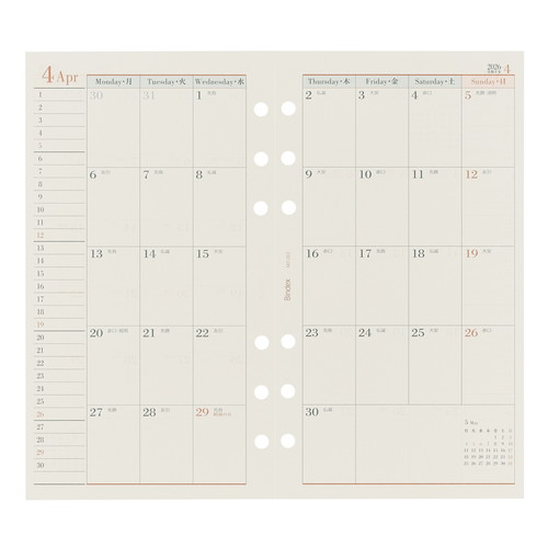能率手帳の会社がつくるシステム手帳ブランドBindex by NOLTY (バインデックス バイ ノルティ)のリフィル(バイブルサイズ)。 ブロック型とタテ型の2つのスケジュール欄。 見開きで異なる2つのスケジュール管理が可能。 ※日記欄を5週タイプと6週タイプの併用型にしました。