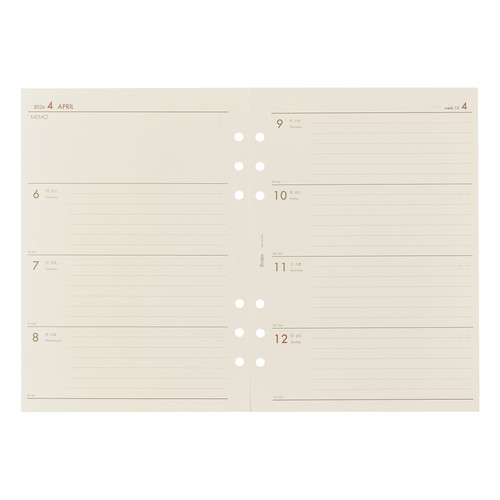 能率手帳の会社がつくるシステム手帳ブランドBindex by NOLTY (バインデックス バイ ノルティ)のリフィル(A5サイズ)。 日誌としても使えるケイ線入り。 見開き1週間タイプ。
