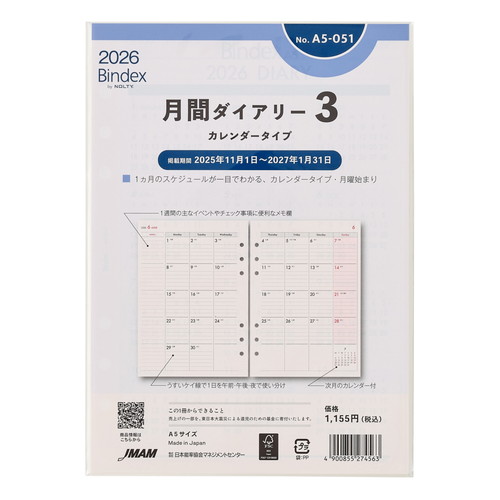 能率手帳の会社がつくるシステム手帳ブランドBindex by NOLTY (バインデックス バイ ノルティ)のリフィル(A5サイズ)。 1ヵ月のスケジュールが一目でわかる、カレンダータイプ。メモ欄付。