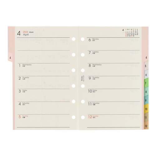 能率手帳の会社がつくるミニ6穴サイズシステム手帳用リフィル。カラフルな月別インデックス付。 インデックス強化シール付。 カレンダーにスケジュール、2週間タイプに日記を記入したり、プライベートとビジネスを分けて記入できる。 カレンダーは日曜始まり。 Petit PAGEMは2026年版よりBindex by NOLTYへのブランド統合を予定しております。
