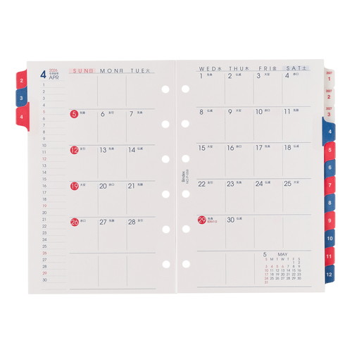 能率手帳の会社がつくるミニ6穴サイズシステム手帳用リフィル。 丈夫で汚れにくいインデックス付。 壁掛けカレンダーに多い日曜始まり。 仕事とプライベートを別々に管理。 Petit PAGEMは2026年版よりBindex by NOLTYへのブランド統合を予定しております。