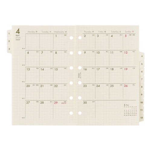 能率手帳の会社がつくるミニ6穴サイズ手帳用リフィル。 日記欄と方眼メモページがセットになった月別管理タイプ。 月毎のスケジュール管理や記録に便利です。 月間日記欄も方眼メモページと同じグリットになっており、違和感なく使う事ができます。 ※当商品はPetit PAGEM定番リフィールNo.P-453 方眼メモ(クリーム)100枚入りと同じ方眼をベースにしており、必要に応じてメモを追加していただく事ができます。 Petit PAGEMは2026年版よりBindex by NOLTYへのブランド統合を予定しております。