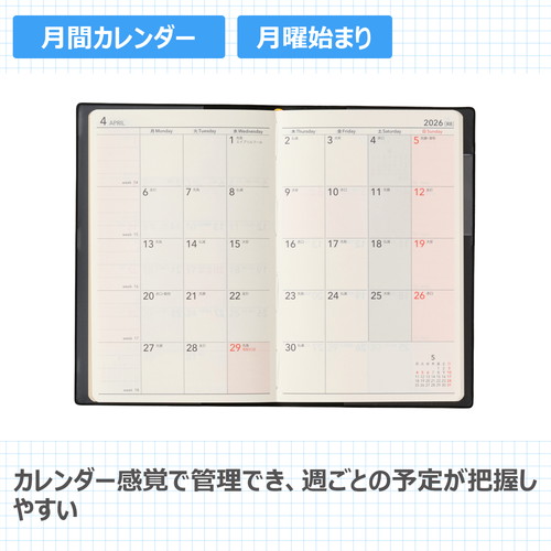 シャツの胸ポケットに収まる薄くて軽いマンスリー手帳コンパクトでも記入スペースをたっぷり取りました。【月間ページ】見開き1ヶ月のベーシックなブロックタイプ。5週、6週併用のレイアウトです。