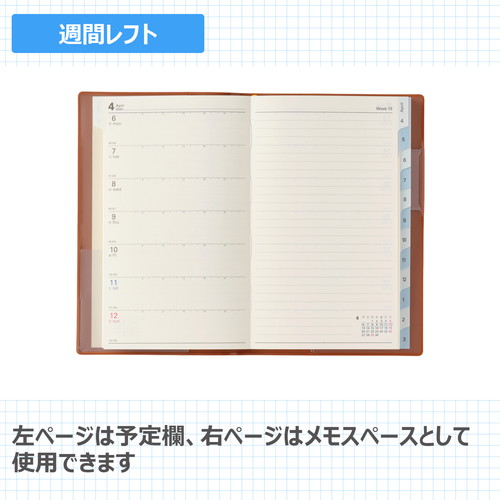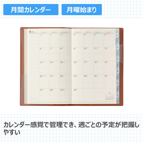 「どんな手帳を買ったらいいかのわからない」というお悩みをお持ちの方にぴったりのシリーズ見たい月をパッと開くことができる便利なインデックス付きです。【月間ページ】見開き1ヶ月のベーシックなブロックタイプ(月曜始まり)。【週間ページ】見開き1週間のレフトタイプ(月曜始まり)。予定とメモにバランスよく使えるので、初心者にもおすすめのレイアウトです。
