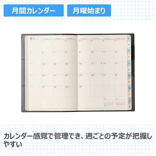 日経WOMAM誌と共同開発した、機能性と高級感を兼ね備えた大人気シリーズ 開きたい月がすぐに見られる便利なインデックス付き。【月間ページ】見開き1ヶ月のベーシックなブロックタイプ(月曜始まり)。【週間ページ】見開き1週間で、月曜~金曜を中心に時間軸を配置したバーチカルタイプ。時間管理をしっかりしたい方にオススメです。