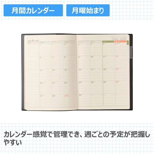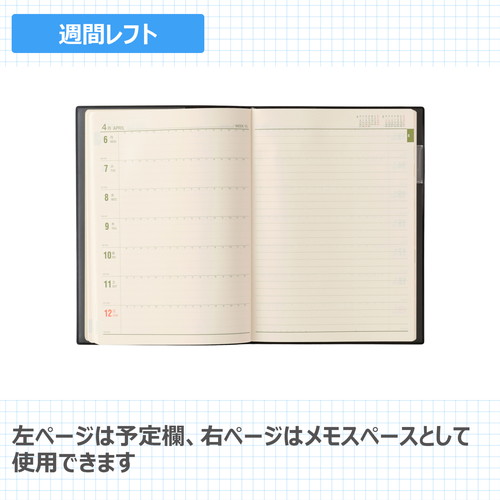 70年以上の歴史を誇る「能率手帳」の大判サイズメモページがノート1冊分以上あり、手帳とノートを一括管理したい人におすすめです。【月間ページ】見開き1ヶ月のベーシックなブロックタイプ(月曜始まり)。【週間ページ】見開き1週間で左ページに予定、右ページはメモスペースとして使えるレフトタイプ(月曜始まり)。