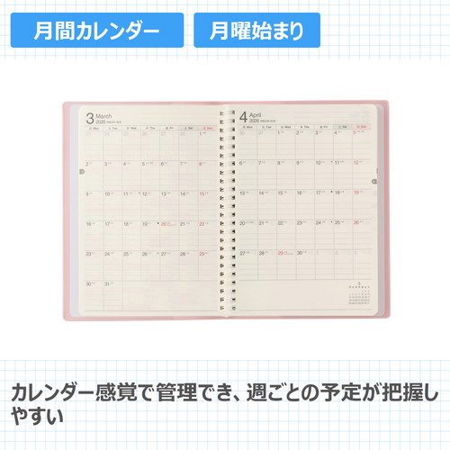 フラットに開く書き込みに便利なリング式ダイアリーリング式だから、180度はもちろん、360度開いて片手で持ちながらの記入が可能です。【月間ページ】見開き2ヶ月のベーシックなブロックタイプ(月曜始まり)。【週間ページ】見開き1週間で左ページに予定、右ページはメモスペースとして使えるレフトタイプ(月曜始まり)。