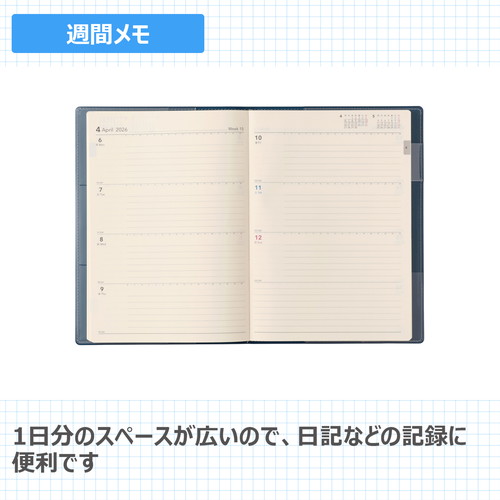 「書く」ことを第一に考えた記入スペース充実のシンプルダイアリーメモページがノート1冊分あり、手帳とノートを一括管理したい人におすすめ。【月間ページ】見開き1ヶ月のベーシックなブロックタイプ(月曜始まり)。【週間ページ】見開き1週間で、左右のページに日付が分割されているメモタイプのレイアウト(月曜始まり)。