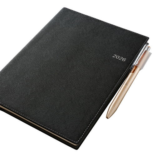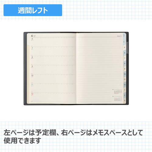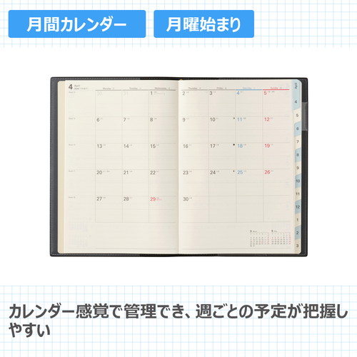 検索に便利なインデックス付きデスクダイアリー月間と週間が連続したレイアウトで、月ごとにまとめて予定を組むのに適しています。【月間ページ】見開き1ヶ月のベーシックなブロックタイプ(月曜始まり)。【週間ページ】見開き1週間で左ページに予定、右ページはメモスペースとして使えるレフトタイプ(月曜始まり)。