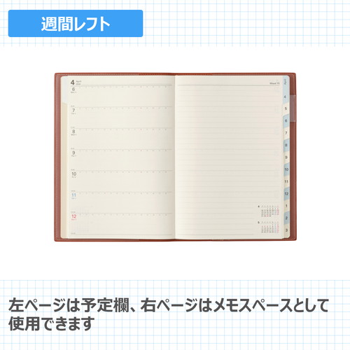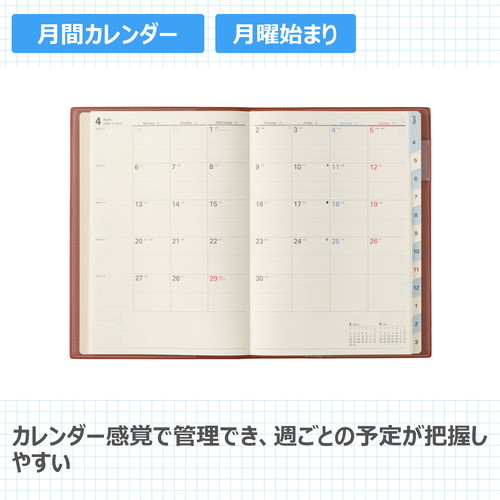 検索に便利なインデックス付きデスクダイアリー月間と週間が連続したレイアウトで、月ごとにまとめて予定を組むのに適しています。【月間ページ】見開き1ヶ月のベーシックなブロックタイプ(月曜始まり)。【週間ページ】見開き1週間で左ページに予定、右ページはメモスペースとして使えるレフトタイプ(月曜始まり)。