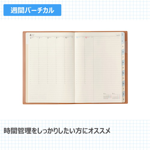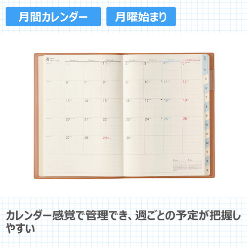 検索に便利なインデックス付きデスクダイアリー月間と週間が連続したレイアウトで、月ごとにまとめて予定を組むのに適しています。【月間ページ】見開き1ヶ月のベーシックなブロックタイプ(月曜始まり)。【週間ページ】見開き1週間で全面に時間軸を配置したバーチカルタイプにメモスペースも確保したレイアウト。時間管理とメモをしっかりしたい方にオススメです。