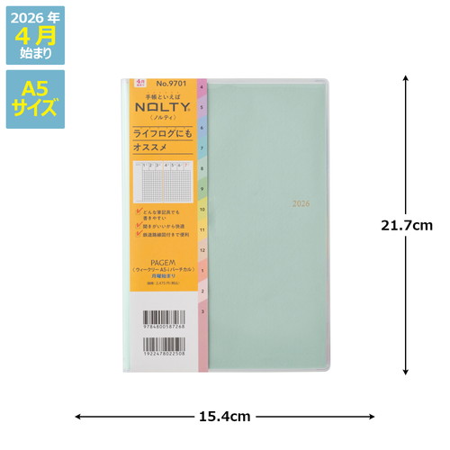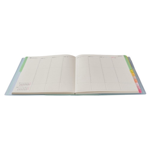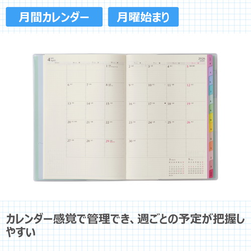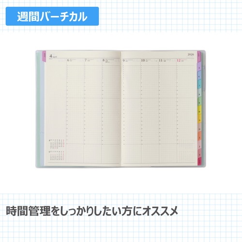 【月間ページ】見開き1ヶ月のベーシックなブロックタイプ(月曜始まり)。カレンダー感覚で月ごとの予定が把握しやすいのが特徴で、見たいページをパッと開けるインデックス付きです。【週間ページ】見開き1週間で全面に時間軸を配置したバーチカルタイプ。土日にも時間軸が入っているので、1日に複数の予定が入ったり、週末も細かい時間管理をしたい人におすすめです。 旧商品名「4月始まり王様のブランチ×ペイジェムウィークリーA5-iバーチカル月曜」