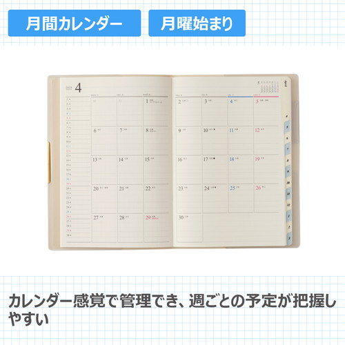PAGEM(ペイジェム)のマンスリー手帳シリーズは、1ヶ月の予定をパッと見渡すことができ、軽くて持ち運びの際にもかさばらないのが特徴です。【月間ページ】見開き1ヶ月のベーシックなブロックタイプ(月曜始まり)。カレンダーと同じような感覚で見ることができ、月ごとの予定が把握しやすいのが特徴です。