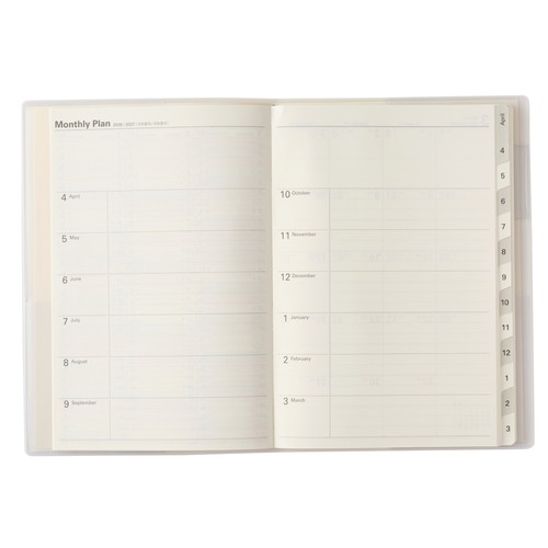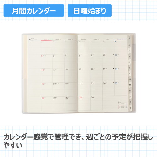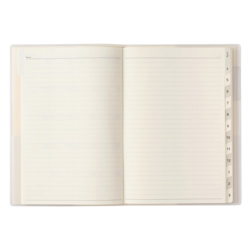 大切な計画や記録を預けて思考を整理。 【計画しやすい】巻頭のプランページを活用すると、実現したい未来の目標を可視化したり、進捗状況をチェックしたりすることができます。 【記録しやすい】月と月の間には罫と方眼のメモページ。月ごとの出来事やアイデアを記録することで、思考を整理できます。 【保管しやすい】表紙の内側に収納に便利なポケットが4つ。大切なメモや写真、カードなどをさっと預けて保管できます。