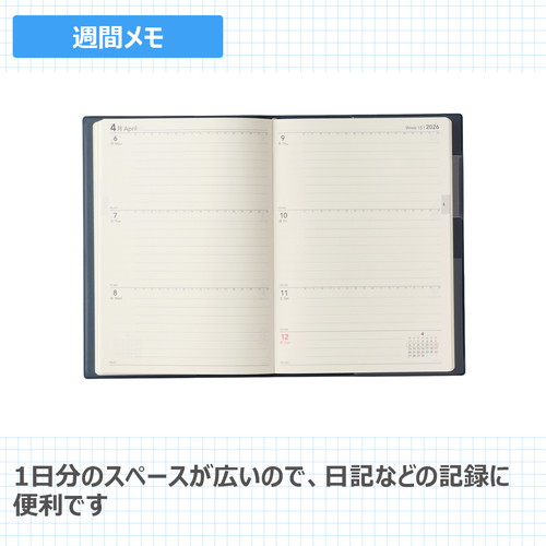 「書く」ことを第一に考えた記入スペース充実のシンプル手帳無駄のないすっきりとしたデザインで、土日に薄く色をつけるなど機能性も抜群です。【月間ページ】見開き1ヶ月のベーシックなブロックタイプ(月曜始まり)。【週間ページ】見開き1週間で、左右のページに日付が分割されているメモタイプのレイアウト(月曜始まり)。