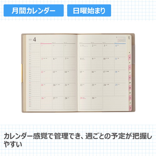 PAGEM(ペイジェム)のマンスリー手帳シリーズは、1ヶ月の予定をパッと見渡すことができ、軽くて持ち運びの際にもかさばらないのが特徴です。【月間ページ】見開き1ヶ月のベーシックなブロックタイプ(日曜始まり)。カレンダーと同じような感覚で見ることができ、月ごとの予定が把握しやすいのが特徴です。