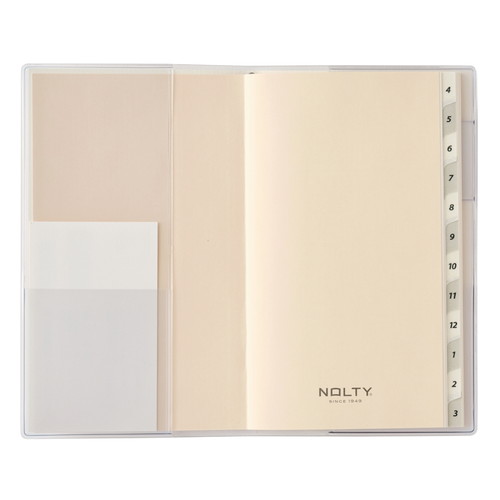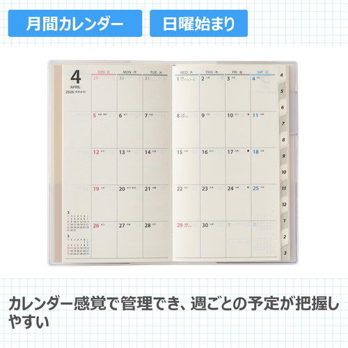 バリエーション豊かな薄型マンスリー。新色も続々登場しています!【月間ページ】見開き1ヶ月のベーシックなブロックタイプ(日曜始まり)。カレンダー感覚で月ごとの予定が把握しやすいのが特徴で、見たいページをパッと開けるインデックス付きです。