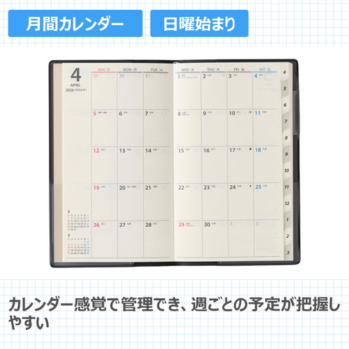 バリエーション豊かな薄型マンスリー。新色も続々登場しています!【月間ページ】見開き1ヶ月のベーシックなブロックタイプ(日曜始まり)。カレンダー感覚で月ごとの予定が把握しやすいのが特徴で、見たいページをパッと開けるインデックス付きです。