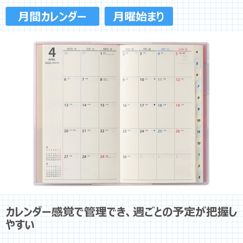 バリエーション豊かな薄型マンスリー。新色も続々登場しています!【月間ページ】見開き1ヶ月のベーシックなブロックタイプ(月曜始まり)。カレンダー感覚で月ごとの予定が把握しやすいのが特徴で、見たいページをパッと開けるインデックス付きです。