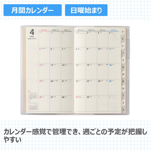 バリエーション豊かな薄型マンスリー。新色も続々登場しています!【月間ページ】見開き1ヶ月のベーシックなブロックタイプ(日曜始まり)。カレンダー感覚で月ごとの予定が把握しやすいのが特徴で、見たいページをパッと開けるインデックス付きです。