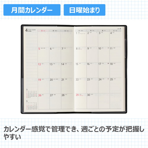 バリエーション豊かな薄型マンスリー。新色も続々登場しています!【月間ページ】見開き1ヶ月のベーシックなブロックタイプ(日曜始まり)。カレンダーと同じような感覚で見ることができ、月ごとの予定が把握しやすいのが特徴です。