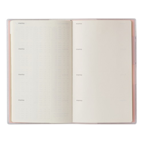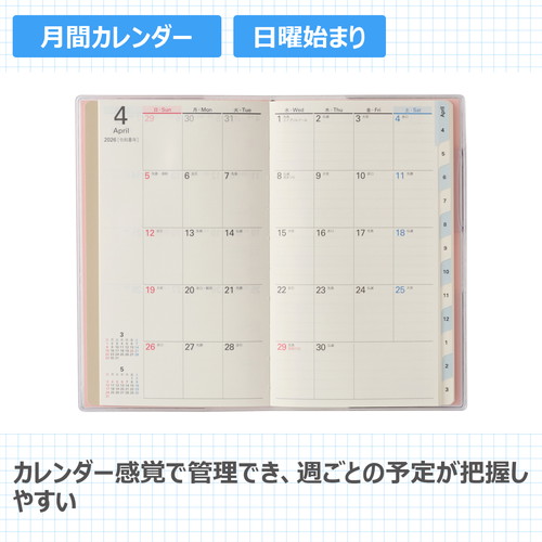 PAGEM(ペイジェム)のマンスリー手帳シリーズは、1ヶ月の予定をパッと見渡すことができ、軽くて持ち運びの際にもかさばらないのが特徴です。【月間ページ】見開き1ヶ月のベーシックなブロックタイプ(日曜始まり)。カレンダー感覚で月ごとの予定が把握しやすいのが特徴で、見たいページをパッと開けるインデックス付きです。