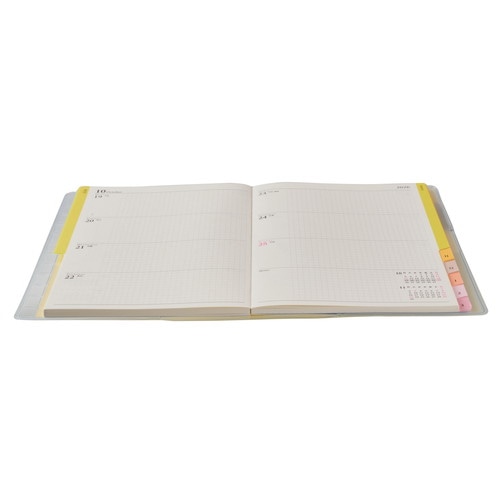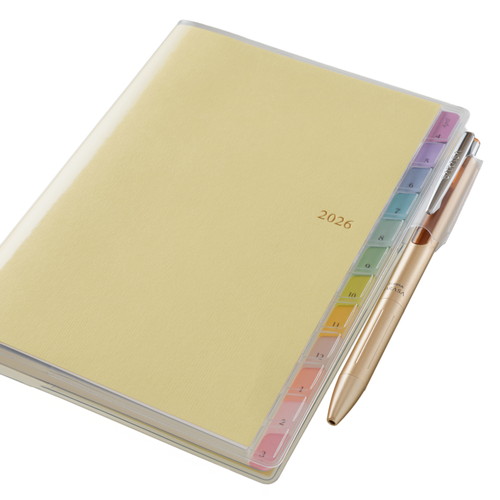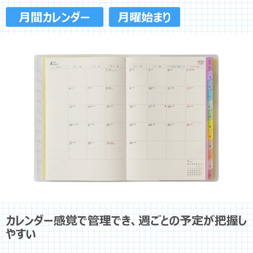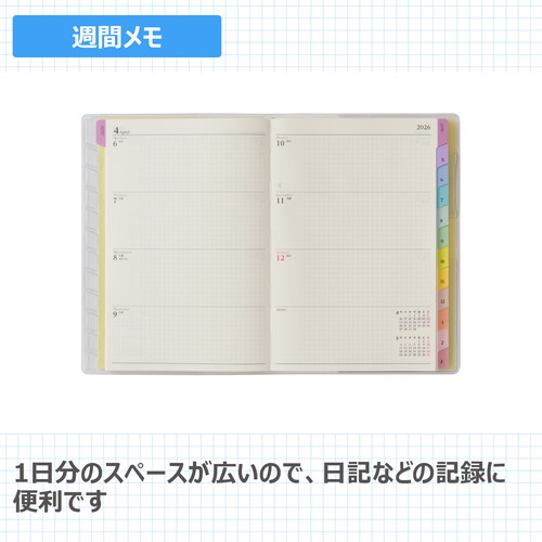 【月間ページ】見開き1ヶ月のベーシックなブロックタイプ(月曜始まり)。カレンダー感覚で月ごとの予定が把握しやすいのが特徴で、見たいページをパッと開けるインデックス付きです。【週間ページ】見開き1週間で、左右のページに日付が分割されているメモタイプのレイアウト(月曜始まり)。1日分のスペースが広いので、日記や食事の記録などに便利です。【別冊】「マネーチェック」「ヘルスマネジメント」など生活に役立つスペシャルリストブック付きです。旧商品名「4月始まり王様のブランチ×ペイジェムウィークリーB6-iメモ月曜」