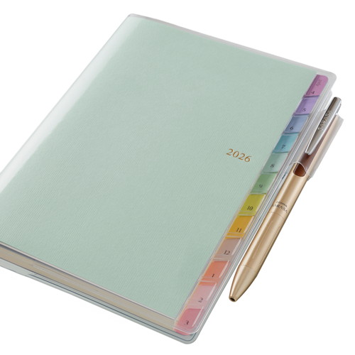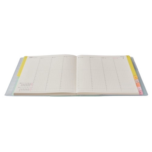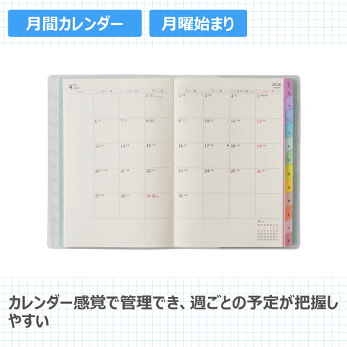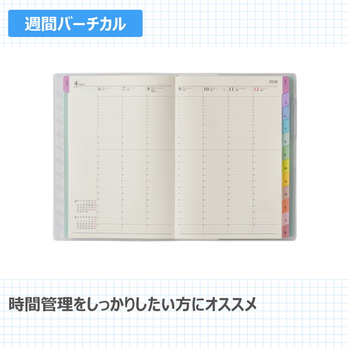 【月間ページ】見開き1ヶ月のベーシックなブロックタイプ(月曜始まり)。カレンダー感覚で月ごとの予定が把握しやすいのが特徴で、見たいページをパッと開けるインデックス付きです。【週間ページ】見開き1週間で全面に時間軸を配置したバーチカルタイプ。土日にも時間軸が入っているので、1日に複数の予定が入ったり、週末も細かい時間管理をしたい人におすすめです。【別冊】「マネーチェック」「ヘルスマネジメント」など生活に役立つスペシャルリストブック付きです。旧商品名「4月始まり王様のブランチ×ペイジェムウィークリーB6-iバーチカル月曜」