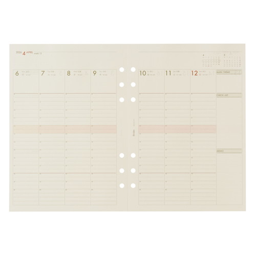 空き時間の把握がしやすいバーチカルタイプ30分刻みの時間目盛り入り。1週間のメインテーマ記入欄やチェックリスト付きです。