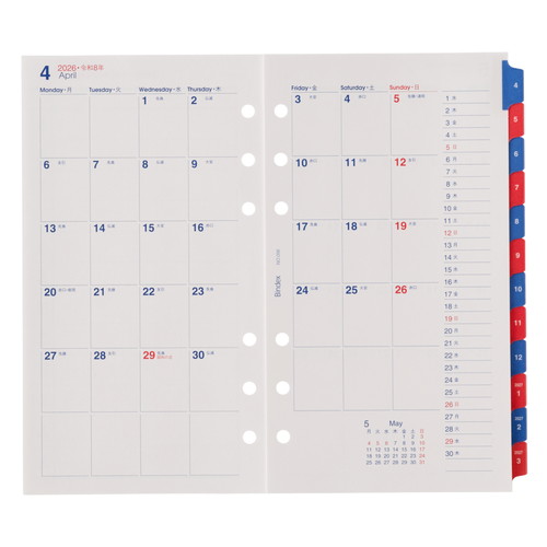 検索に便利なインデックス付きカレンダータイプバイブルサイズのNo.1人気ダイアリーリフィールです。右端のタテ型スケジュールを使う事で、見開きで異なる2つのスケジュール管理が可能です。