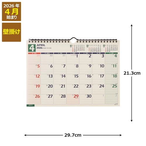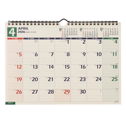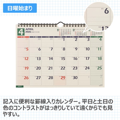 記入に便利な罫線入りA4サイズカレンダー。書き込みやすいNOLTYオリジナル用紙を使用人気デザイン!手狭な場所でも使えます。便利な年間カレンダー付き(2年分)