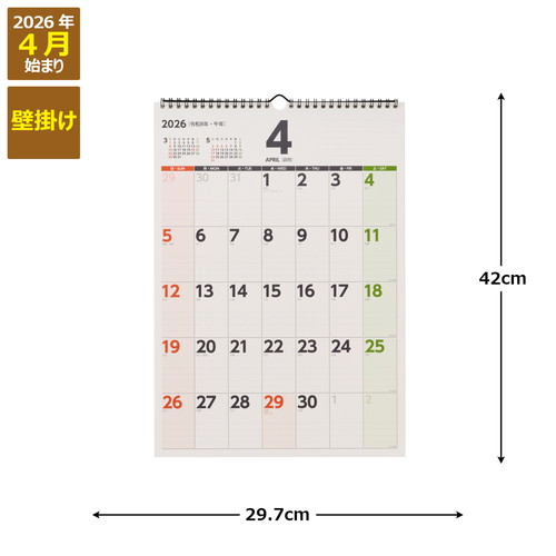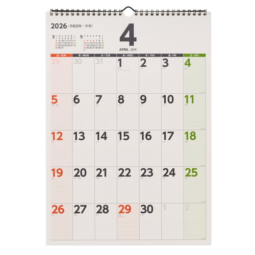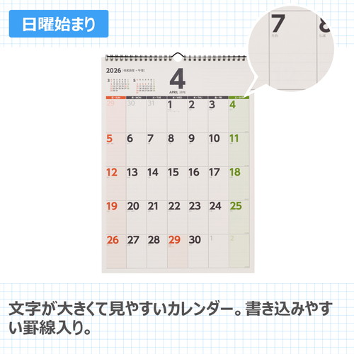 文字が大きくて見やすいカレンダー明るい配色ですっきりとしたデザインです。書き込みやすい罫線入りで、右上にもメモスペースがあります。便利な年間カレンダー付き(2年分)。