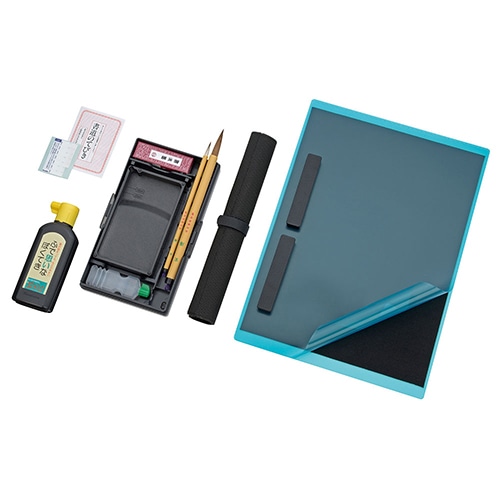 お習字をする方が使いやすい内容品がセットされた書道セット。耐衝撃性に優れたEVA素材をバッグに使用、衝撃から中身を守ります。内容品一覧:固形墨/ふで思いなぼくてき(180ml)/筆(太筆・細筆セット)/ぼくちすずり(5.3寸)/文鎮二本組/下敷/水差し/かんたん筆巻/半紙ばさみ/左右両用中皿/書道バッグ/書道のてびき/名前シール