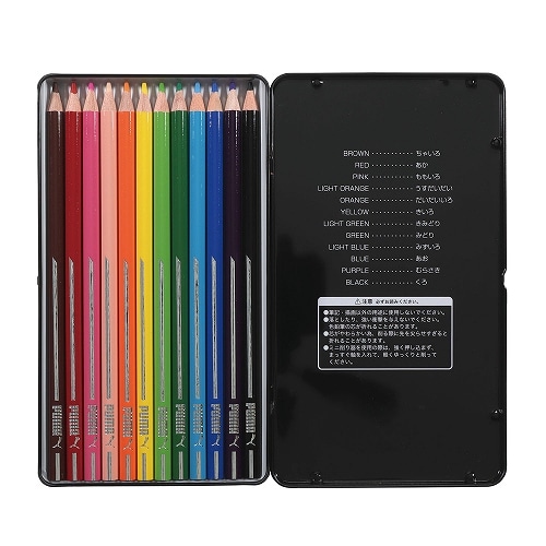 12色入り丸軸の色えんぴつセットです。缶ケース入。缶ケースには名前欄付。