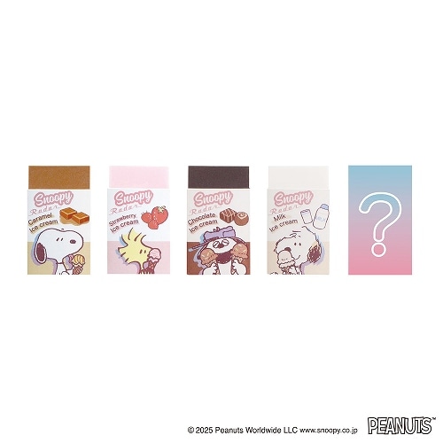 スヌーピーのきょうだいたちが学校帰りにアイスクリームを食べているシーンをイメージした文具シリーズ。わいわいがやがや楽しい雰囲気を表現したデザインです。【検索ハッシュタグ】#ペンケース#スヌーピー#消しゴム#学用品#学童文具#クツワ