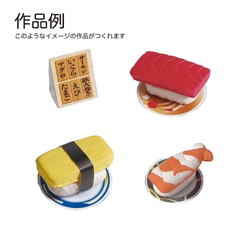レンジで簡単におすしのけしごむが作れるキットです。リアルできれいな形に作れる立体型付。レモン&コーンスープの香り付。かわいく飾れるペーパークラフトが付いています。