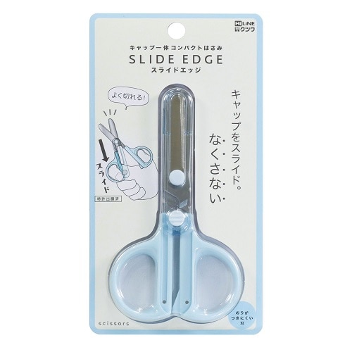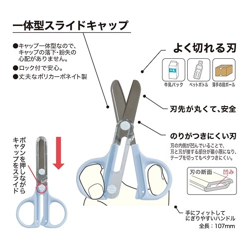 一体型のスライド式キャップが付いたコンパクトサイズのはさみです。キャップ一体型なのでキャップの落下、紛失の心配がありません。ボタンを押しながらキャップをスライドさせて使用、ロック付きなので勝手にスライドすることなく安心です。コンパクトサイズでもペットボトルや薄手の段ボール・牛乳パック等を切ることができます。