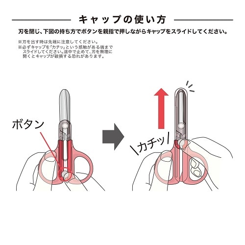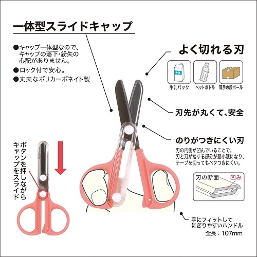 一体型のスライド式キャップが付いたコンパクトサイズのはさみです。キャップ一体型なのでキャップの落下、紛失の心配がありません。ボタンを押しながらキャップをスライドさせて使用、ロック付きなので勝手にスライドすることなく安心です。コンパクトサイズでもペットボトルや薄手の段ボール・牛乳パック等を切ることができます。