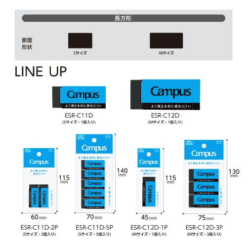 ・Campusはノート中心のブランドから、学生の夢やチャレンジを応援するブランドへ前進します・よく消えるのに折れにくい消しゴムです・コクヨ独自のハイブリッド製法で、よく消えるようにするための吸着成分と折れにくくするための骨格成分を絶妙なバランスで一体化させました・持ち方や狙いやすさに応じた形状デザインです・こまめにちぎれるミシン目の入ったスリーブ付きです