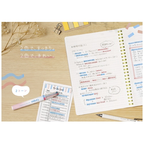 ・期待と不安が入り混じる春の新学期に、ポジティブ&リラックスをテーマにした自分らしくいられるアイテムで、学生の前向きな気持ちを応援します・2026年春の需要期向け限定商品・トーンのそろった2色のペン先で塗り分けができるため、ノートがすっきりきれいに整います・1本で1色のマーキングができるため、ペンケースの中でも省スペースです