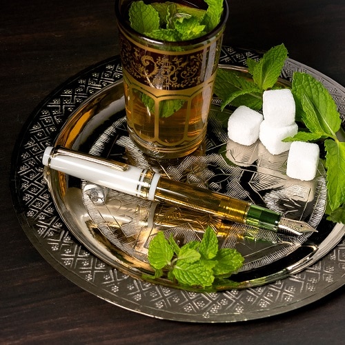 ミントティーのミントはフレッシュスペアミント、砂糖は伝統的にはスッカルという円錐形の大きな砂糖の塊を砕いて使用したティーをイメージした万年筆。14金。中字。【検索ハッシュタグ】#万年筆#セーラー万年筆#世界のティータイム#モロッカンミントティー#インク沼