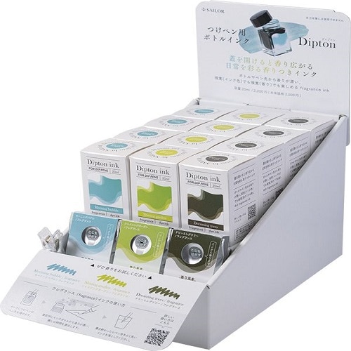 「つけペン専用だからこそ広がる多種多様なインクの魅力」つけペン専用インクシリーズ「Dipton」の初めての香り付きインク。ボトルやペン先から香りが漂い、視覚(インク色)でも嗅覚(香り)でも楽しめる fragrance ink。一日の終わりの手帳タイムなどパーソナルな空間に、癒しの時間を演出します。什器セット。【検索ハッシュタグ】#インク#つけペン用#セーラー万年筆#香り付き#フレグランス