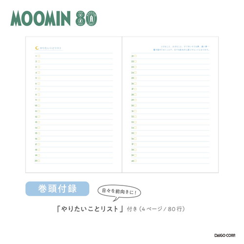 夜とカフェオレと日記帳に、ムーミン小説出版80周年限定デザインが登場!全ページフルカラー、80周年限定アートが毎日を彩ります。本文は4柄ごとの繰り返しで、毎日書いても飽きのこないデザインです。巻頭付録に『やりたいことリスト』付きです。2025年はムーミン小説1作品目の出版80周年。テーマはThe door is always open。ドアに鍵をかけないムーミンやしきは、どんな生きものでも受け入れるのです。帰る場所や居場所の大切さを物語の中で見つけてほしい。物語が始まった80年前から変わることのない想いをデザインに込めました。巻頭の『やりたいことリスト』には、すぐに叶いそうな夢、遠い夢・・・小さなことでも大きなことでも書き留めておくことで、日々を前向きに過ごすヒントになります。チェックボックスがついているので叶ったものからチェックをつけていくのもおすすめです。