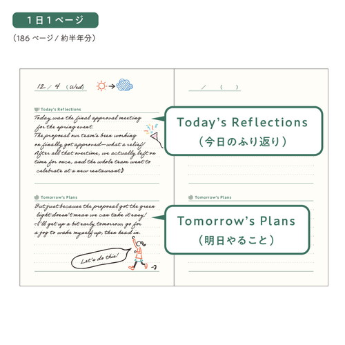 巻頭の『やりたいことリスト』には、すぐに叶いそうな夢、遠い夢・・・小さなことでも大きなことでも書き留めておくことで、日々を前向きに過ごすヒントになります。チェックボックスがついているので叶ったものからチェックをつけていくのもおすすめです。本文は4柄ごとの繰り返しで、毎日書いても飽きのこないデザイン。文庫本サイズなので持ち歩きやすく、省スペースです。【検索ハッシュタグ】#ダイゴー#日記#ログ#記録#習慣