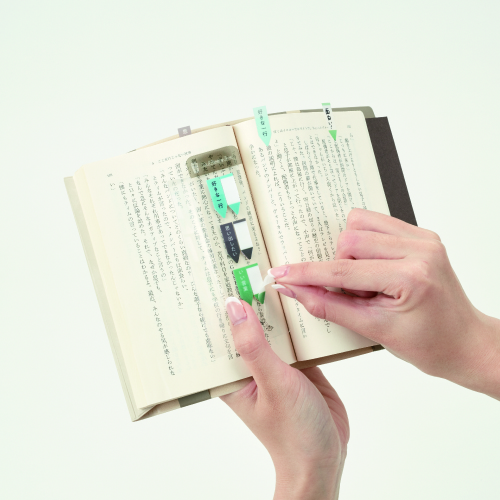 気になった所や読み返したい一文にブックマークできる破れにくく丈夫なフイルムタイプのふせん。無地タイプは自由に書き込めます。しおりになる台紙はポリプロピレン製。ふた付きでふせんをしっかり保護します。