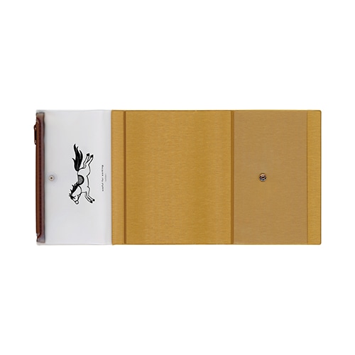 仕事をはかどらせるisshoni.シリーズに限定デザインが登場。2026年のダイアリーやノートと一緒に使いたい、午年デザインです。本体にメタリックのPVCを使用した特別感のあるアイテムに仕上がりました。クリアなPVC素材のカバーは中に入れた物が見えやすく、ペンケース部や前面ポケットにお気に入りの道具やポストカードなどを入れて自分らしくカスタマイズすることができます。ペンケースはスマホや75mmサイズの付箋も入る幅広サイズに設計、よく使う道具をひとまとめにできます。内面ポケットが2つあり、左側は大きいプリントなどをしっかり入れられる深さになっています。両袖にノートを差し込んでも使えます。手帳やノートだけでなく参考書や本を入れるのもおすすめです。